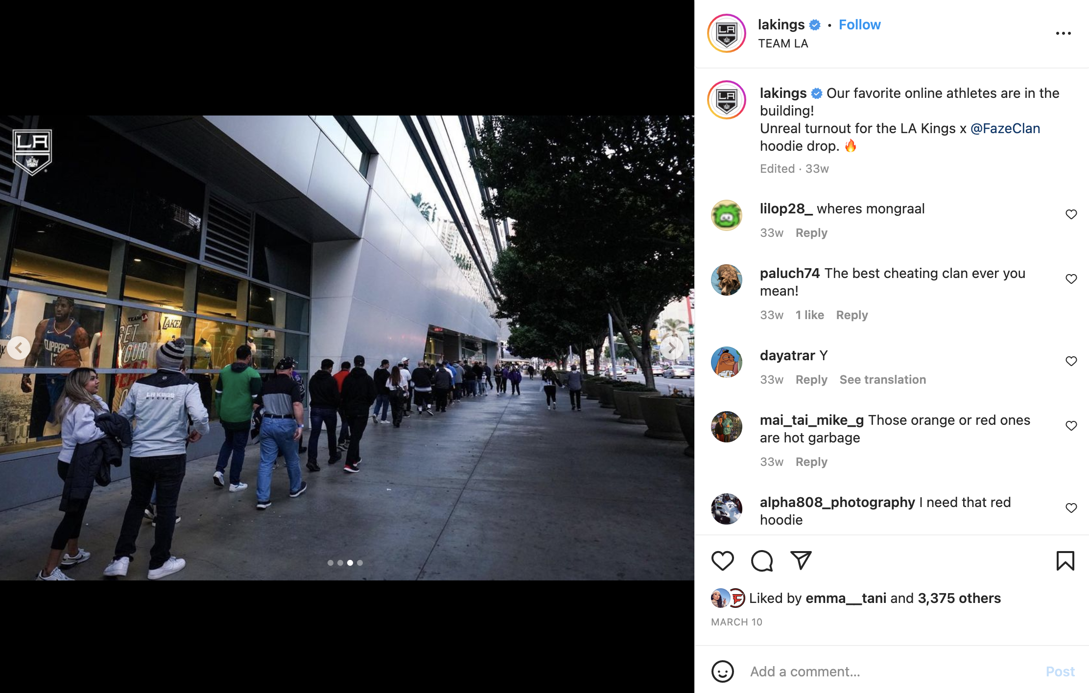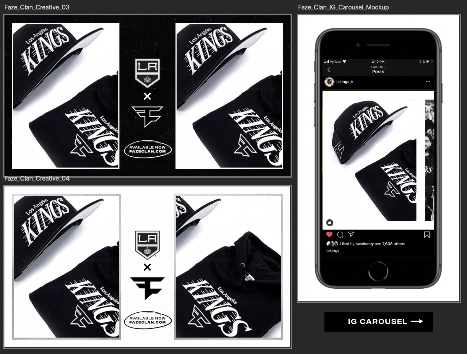 The campaign had to reach across three distinct brands: The LA Kings, FazeClan, and TeamLA. There was also an opportunity to collab on posts earning further reach and affinity for the merch drop in TeamLA.